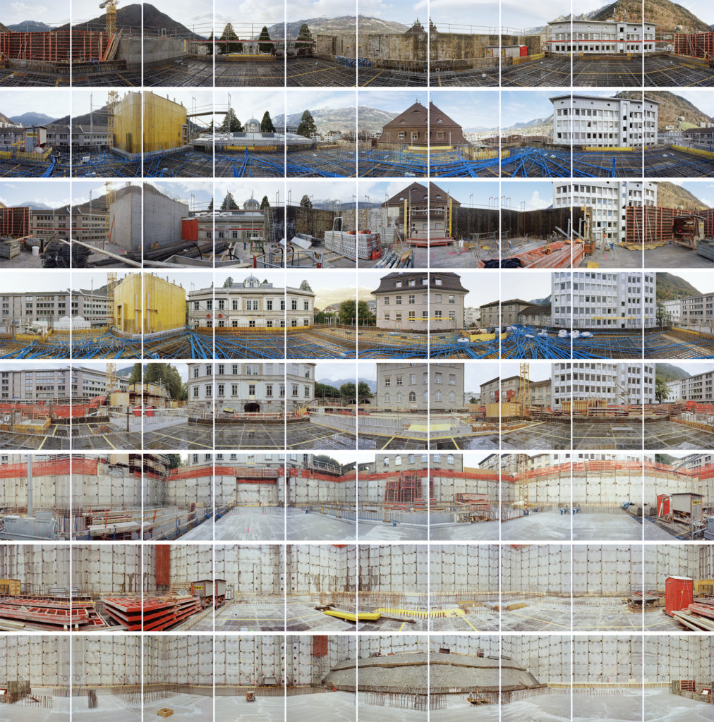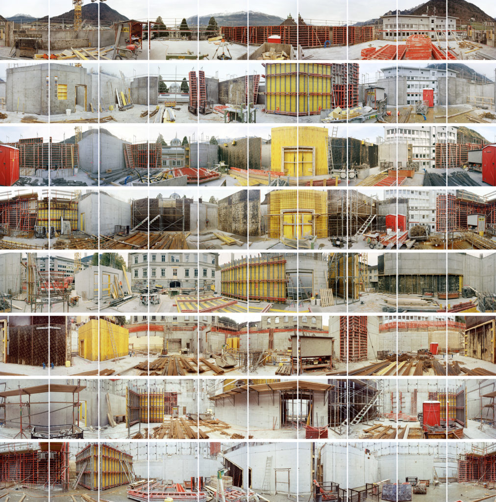 Acht übereinander liegende Bildreihen zeigen die, sich im Bau befindenden acht Etagen des Bündner Kunstmuseum Chur. Von einem zentralen Standpunkt aus aufgenommen, ist jede der Etagen mit einem zehn Bilder umfassenden Rundumblick dokumentiert. Der ganze Bildaufbau wird in seiner Mehrteiligkeit zudem verdoppelt: Das Werk „building building“ ist ein Diptychon. Dies ermöglicht pro Etage zwei Rundumblicke zu unterschiedlichen Bauzeitpunkten. Das Zeitliche schreibt sich damit nicht nur mit jeder Bildreihe und mit jeder gebauten Etage in das Werk ein, sondern wird auch beim Querlesen des Diptychon spürbar.