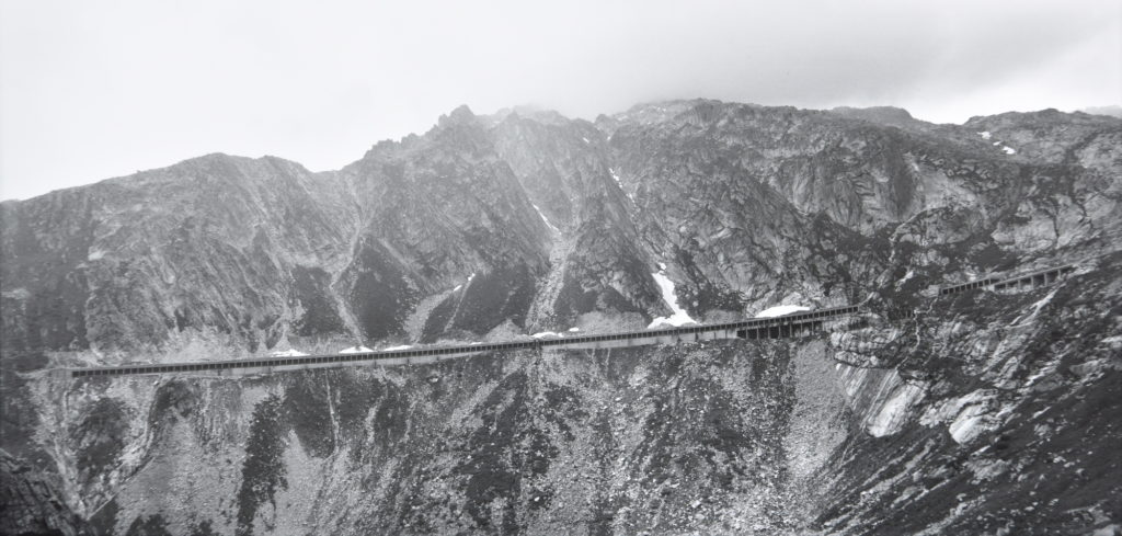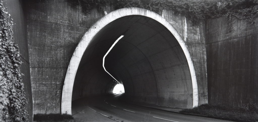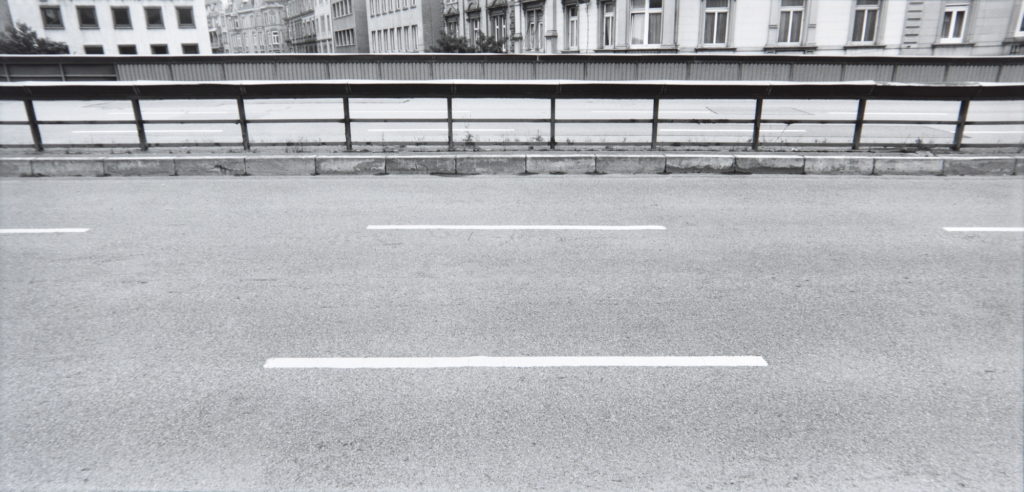 Die gleiche Verschärfung der Perspektive erreicht Schenk in panoramaformatigen Aufnahmen von erhöhtem Standort auf vierspurige Autoschneisen («Charlottenplatz», «Wildparkstrasse»). Hier entstehen mit dem Medium der Dokumentarfotografie Bilder, die den Weg als Raumlinie in ein Zeichen für Zeit und Geschwindigkeit verwandeln. Menschen- und autoleere Strassen, eine Brücke als Bauruine – Vanitassymbole? Das helle Loch am Ende eines düsteren Tunnels («Dachswald») lässt sich auch als frohe Kunde verstehen nach dem Motto: Stell dir vor, eine neue Autobahn und weit und breit kein Auto. Ho